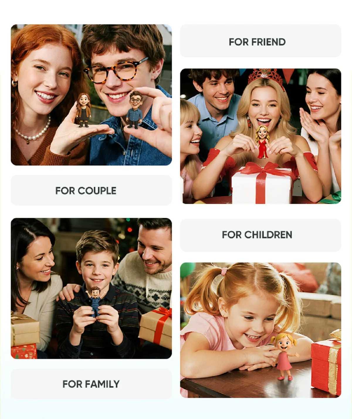 Reliving your best moments is effortless: simply upload a single old photo, and watch us restore it into a beautifully realized 3D figure. Our artists ensure the warmth, emotion, and unique charm of your original picture are perfectly captured in three dimensions.